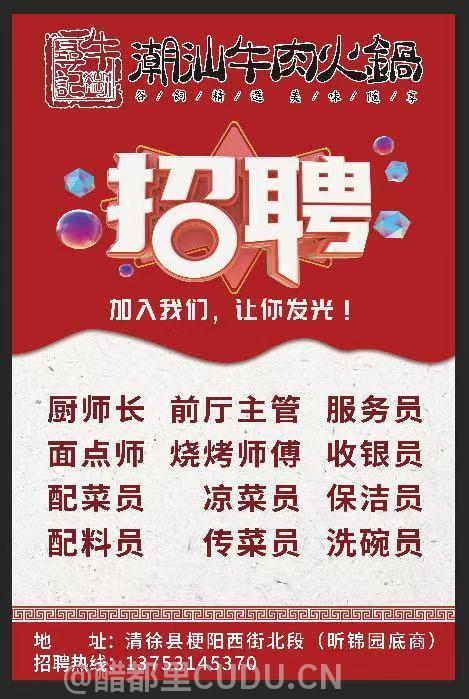 潮汕牛肉火鍋招聘 加入我们,让你发光! 厨师长 前厅主管