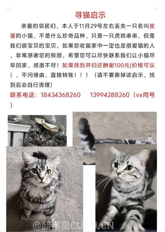 本人于11月29号左右在清徐县北营村丢失了一只黑灰色的虎斑串串,是我们很宝贝的宝贝,如果你找到并归还,酬谢100元,不问缘由,直接转账!!!
