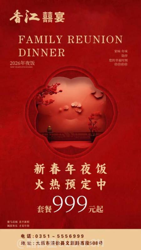 香江喜宴年夜饭·预订开启 除夕团圆宴,香江匠心呈! 席位有限、速订从优, 用年味暖聚全家。 预订热线:0351-5556999